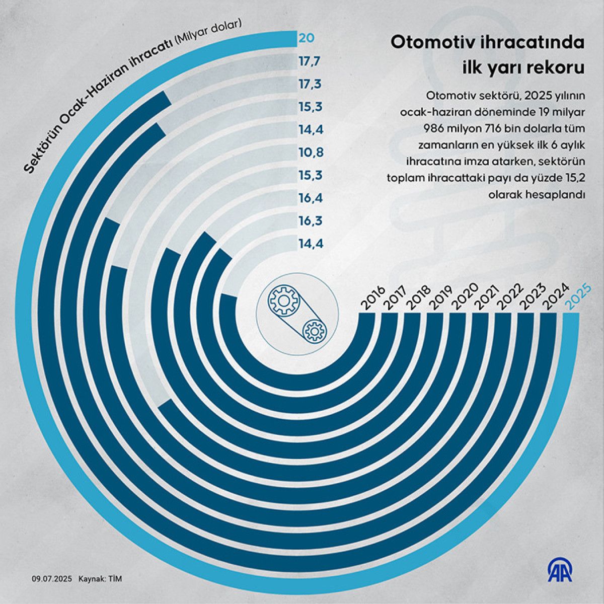 Türkiye İhracatçılar Meclisi (TİM) datalarına nazaran, otomotiv kesimi, yılın birinci yarısında 19 milyar 986 milyon 716 bin dolarla tüm vakitlerin en yüksek ocak-haziran devri ihracatını gerçekleştirdi.