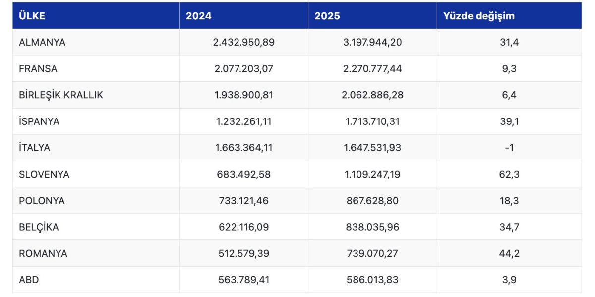 TİM bilgilerine nazaran, geçen yıl ve 2025’in ocak-haziran periyodunda otomotiv sanayisinin en fazla ihracat (bin dolar) gerçekleştirdiği ülkeler şöyle: