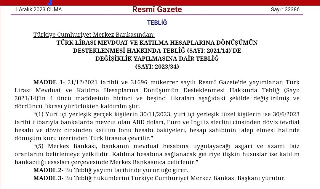 Ayrıca, gerçek kişi dönüşüm hesaplarının tarih koşulunda teknik değişikliğe gidildi. Buna göre, yurt içi yerleşik gerçek kişiler, 30 Kasım 2023 itibarıyla bankalarda mevcut olan altın, dolar, euro ve İngiliz sterlini cinsinden mevduat ve katılım fonu hesaplarını TL'ye çevirebilecek.