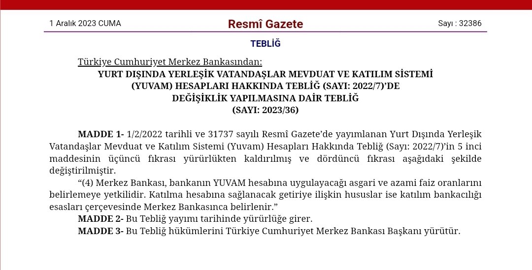 Türkiye Cumhuriyet Merkez Bankası'nın (TCMB) tebliğleri, Resmi Gazete'de yayımlandı.