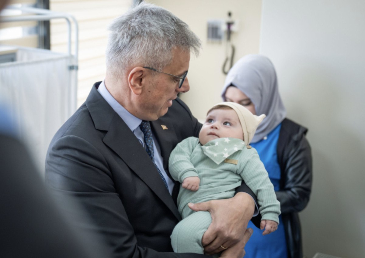 Aşı yapılan bebeklerle ilgilenen Memişoğlu, aileleriyle de bir süre sohbet etti.
