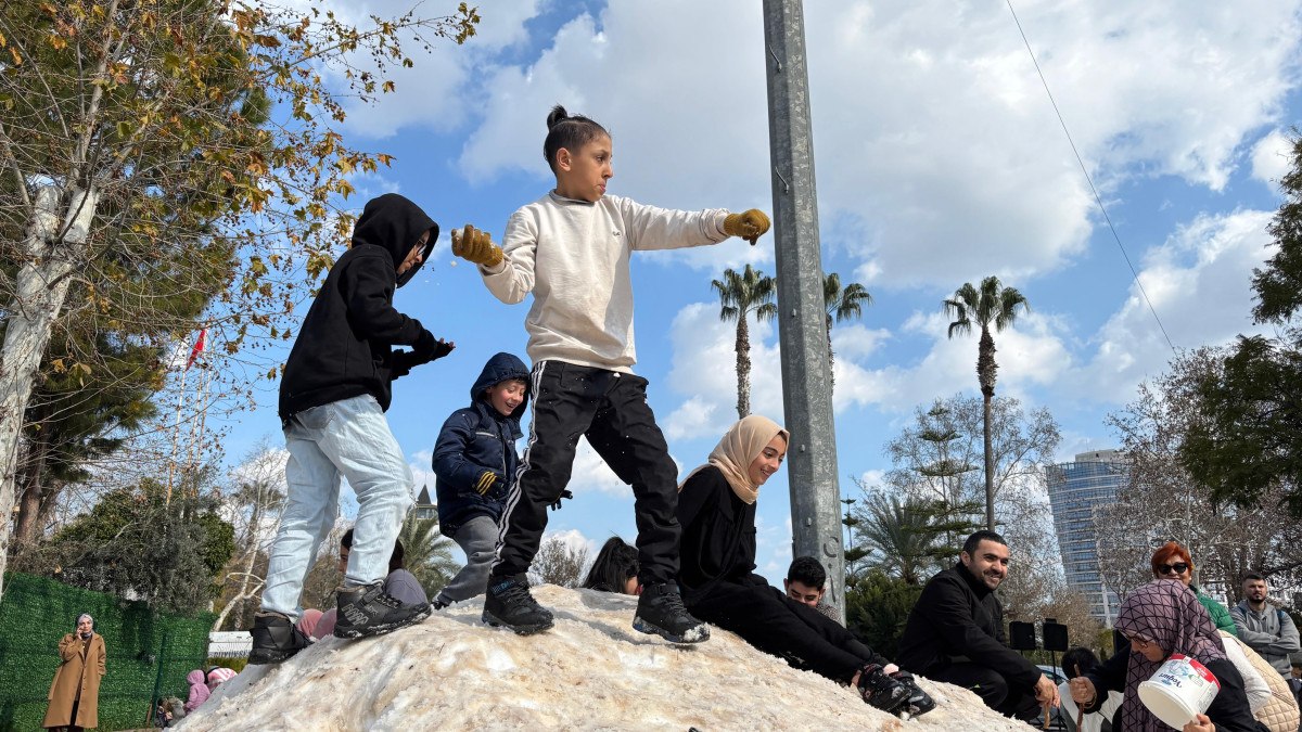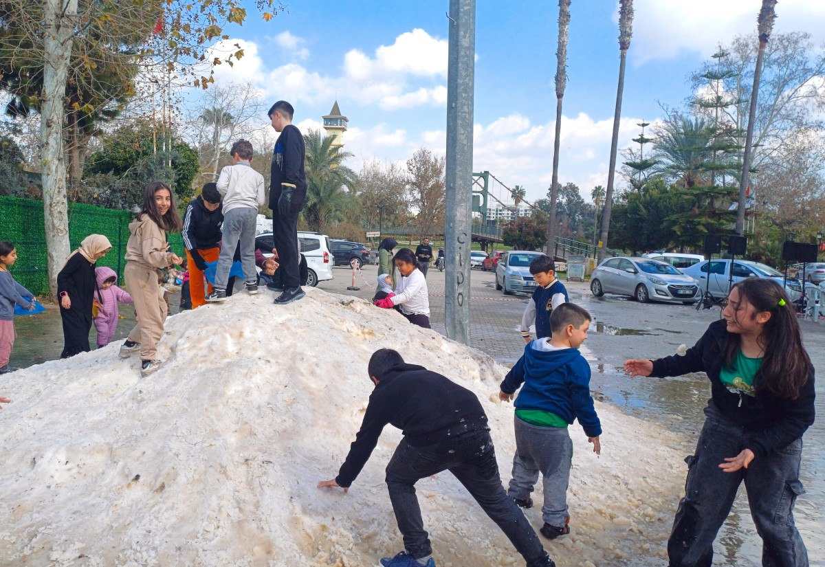 Adana’da Toroslar’dan kamyonlarla Seyhan’da kent merkezine bırakılan kar tepeleri, renkli anlara sahne oldu.