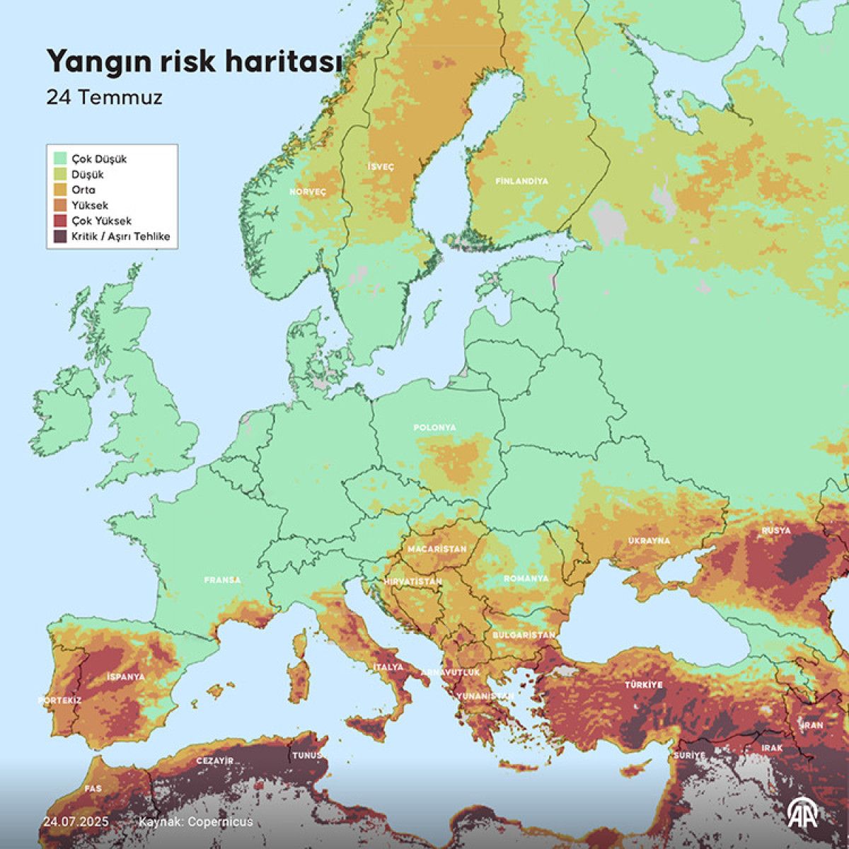 Yangın Hava Durumu Endeksi (FWI) tarafından 22-28 Temmuz tarihlerinde oluşturulan yangın riski haritasında da çok sayıda ülke “çok aşırı”, “aşırı”, “çok yüksek” ve “yüksek” düzeyleri işaret eden kırmızı tonlarıyla gösterildi.