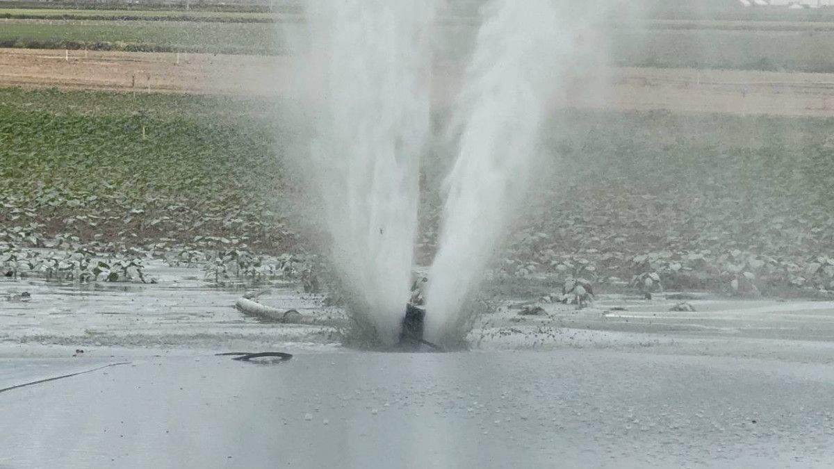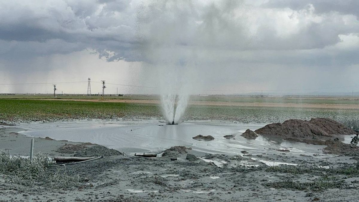 Aksaray’ın Kutlu köyünde ayçiçeği ekili bir tarlarda sondaj çalışması sonucunda kuyudan karbondioksit gazı çıktı, su fışkırdı.