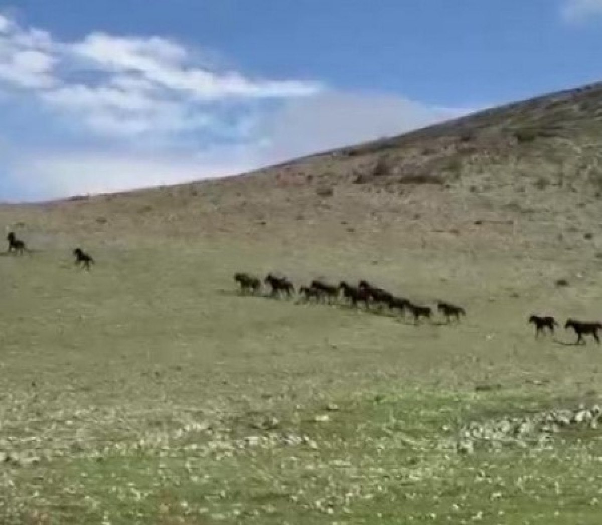 Amasya’nın Akdağ ilçesinde, yaklaşan araçların sesini duyan yılkı atı sürüsü, hızla doğal yaşam alanlarına doğru yöneldi. Sürünün içinde 20’den fazla atın yanı sıra yeni doğan tayların da olduğu dikkat çekti.