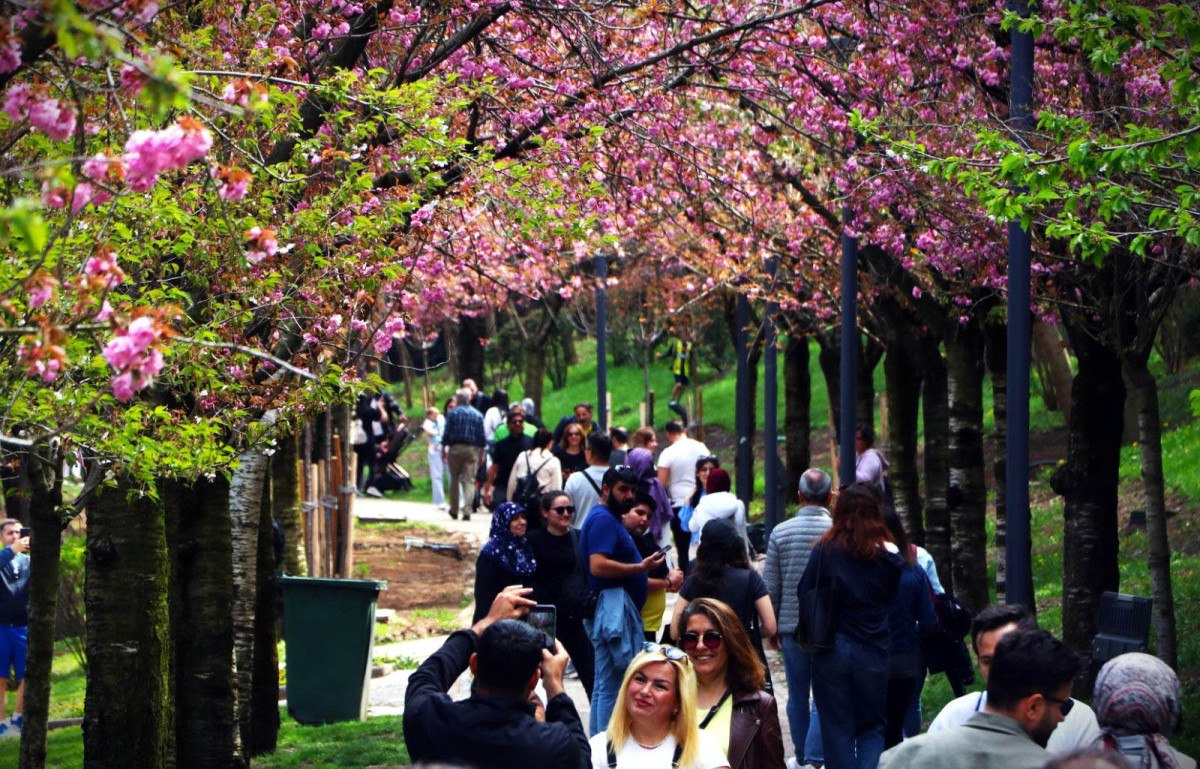 Parka gelenler, farklı tonlarda açan pembe çiçeklerin arasında yürüyüş yapıp, fotoğraf çektirdi.