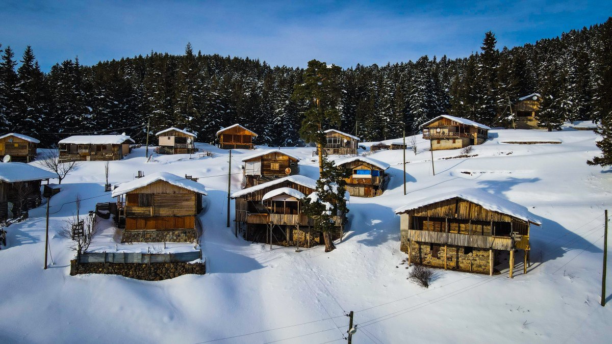 Doğal ve yaşlı ormanlar içinde yer alan ladin, sarıçam ve köknar ağaçlarının etrafına kurulan yayla evlerinin çatıları karla kaplanırken, karayolunda seyahat edenler durup, yol kenarından bol bol fotoğraf çekiyor.