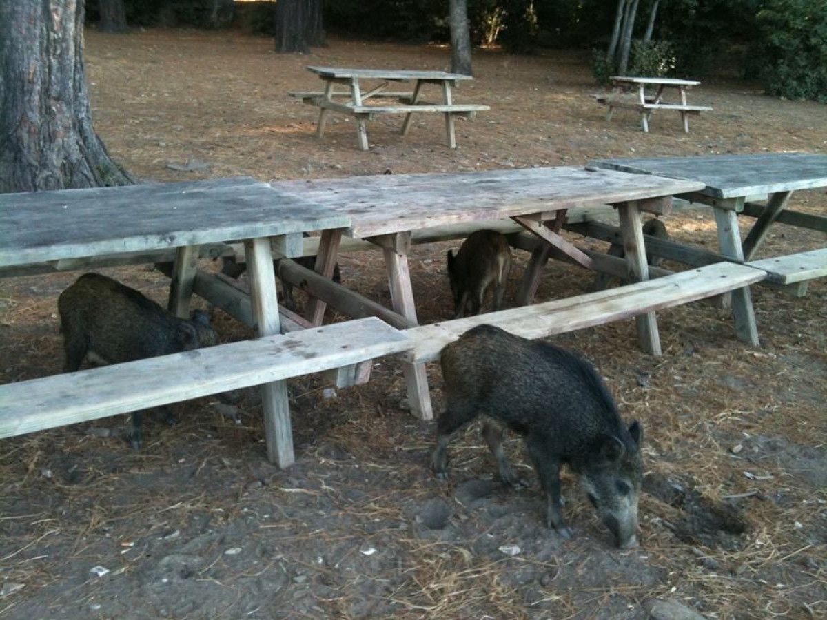 Domuzlar, denize yüzen bayanın eşyalarını bıraktığı yere yaklaşarak çantasını ormana kaçırdı.