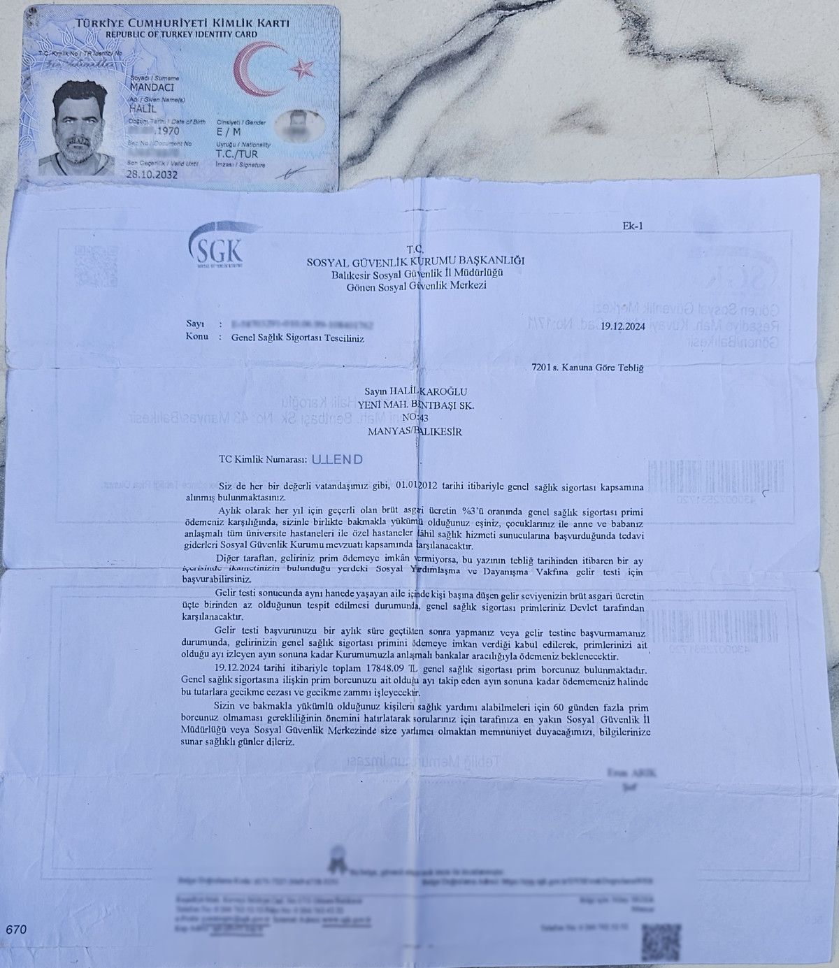 Son olarak 19 Aralık 2024 tarihinde Balıkesir Sosyal Güvenlik İl Müdürlüğü Gönen Toplumsal Güvenlik Merkezi’nden Halil Karaoğlu ismine bir ceza kağıdı geldi. Kelamda sigortalı olarak çalışmışım lakin Halil Karaoğlu ismiyle değil, Halil Mandacı ismiyle.