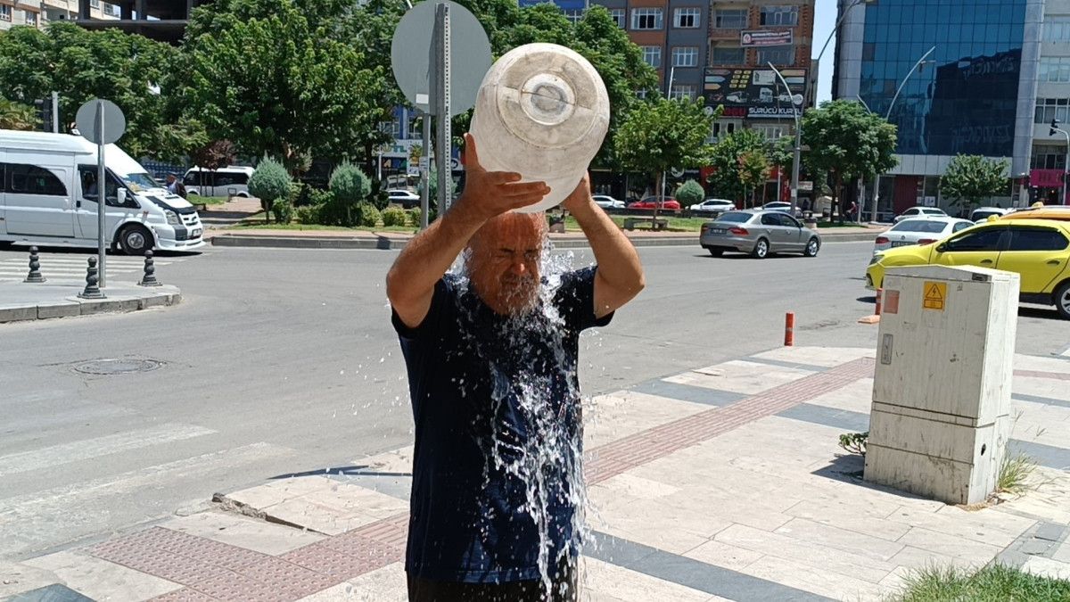 Ekinci, üzerine bidonla soğuk su dökerek serinlemeye çalıştı.