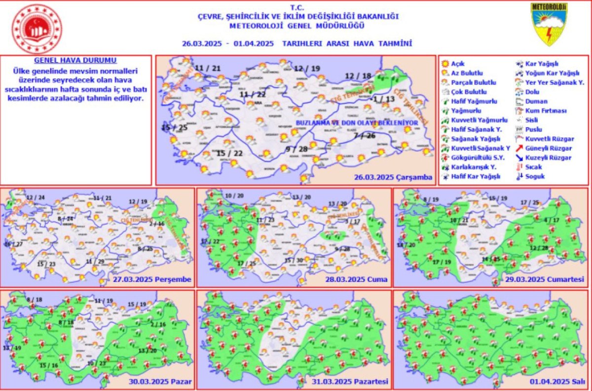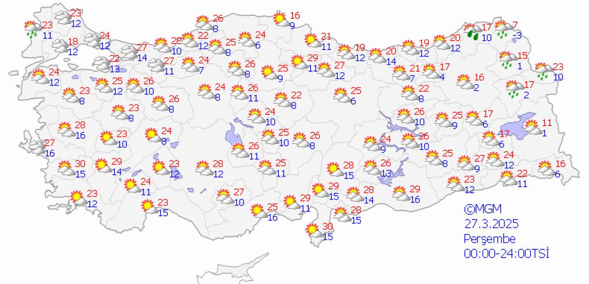 İstanbul’da en düşük 8, en yüksek 19, Ankara’da en düşük 10, en yüksek 21, İzmir’de en düşük 14, en yüksek 20, Antalya’da da 18 derece civarında olması bekleniyor.