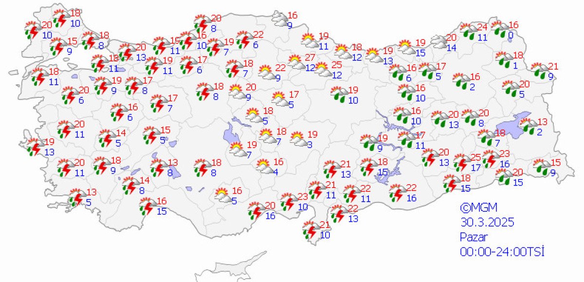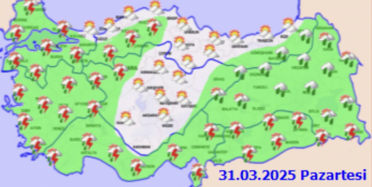 Marmara, Ege, Akdeniz ve Güneydoğu Anadolu bölgelerinde yağışların gök gürültülü sağanak şeklinde olması bekleniyor.