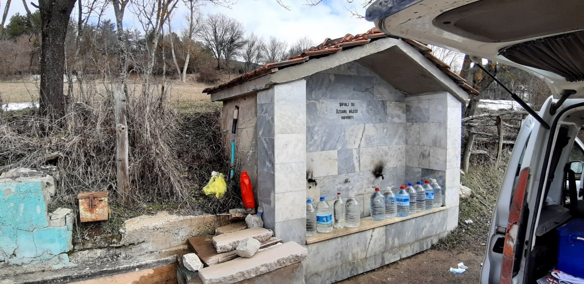 Su bidonlarına litrelerce su dolduran vatandaşlar, şifalı olduğu iddia edilen suyu evlerine götürüyor.