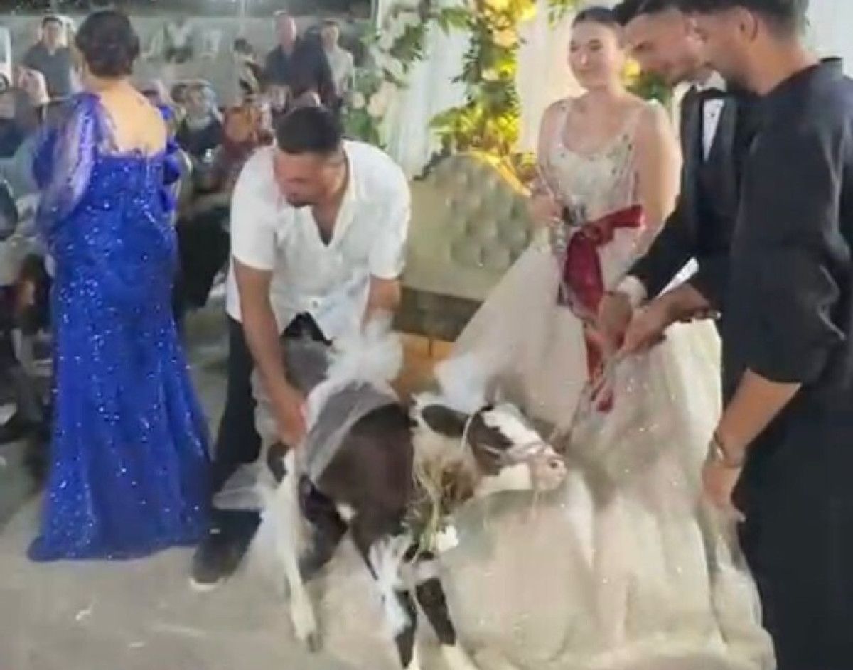 Düğünde takı merasimi yapılırken sağdıçlar Hüseyin Yılmaz ve Taha Çintirli damada takı olarak simental cinsi buzağı armağan etti.