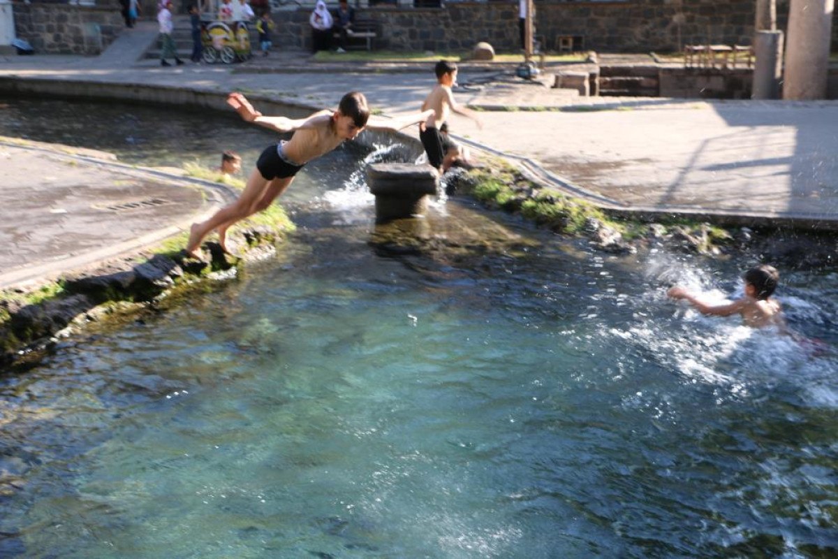 Kentte 1950’lere kadar şehrin üç önemli su kaynaklarından biri olan tarihi Anzele suyu, sıcakların bastırmasıyla başta çocuklar olmak üzere vatandaşların uğrak mekanı haline geldi. Aileleri tarafından da takip edilen çocuklar suyun ve oyunun keyfini doyasıya çıkarıyor.