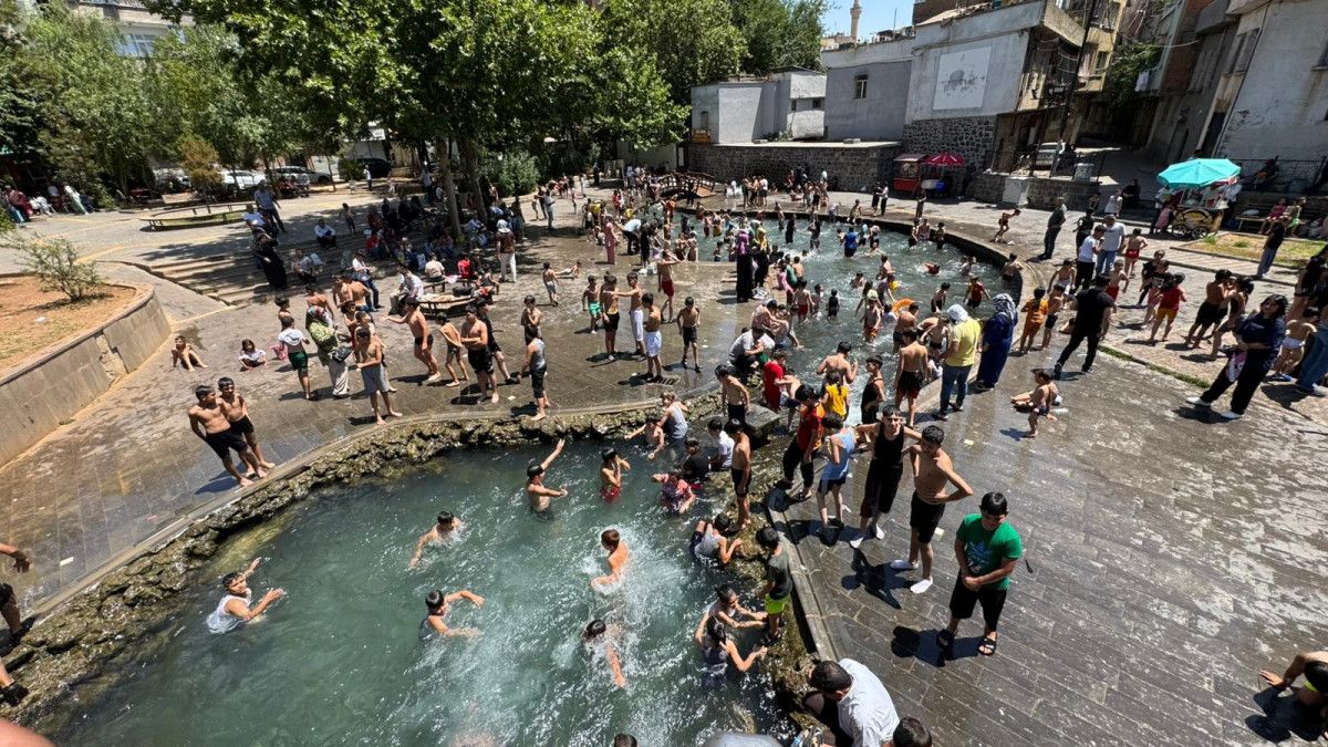 Çocuklar ise tehlikeli ve yasak olmasına karşın Sur ilçesindeki tarihi Anzele Parkı’nın süs havuzunda serinledi.