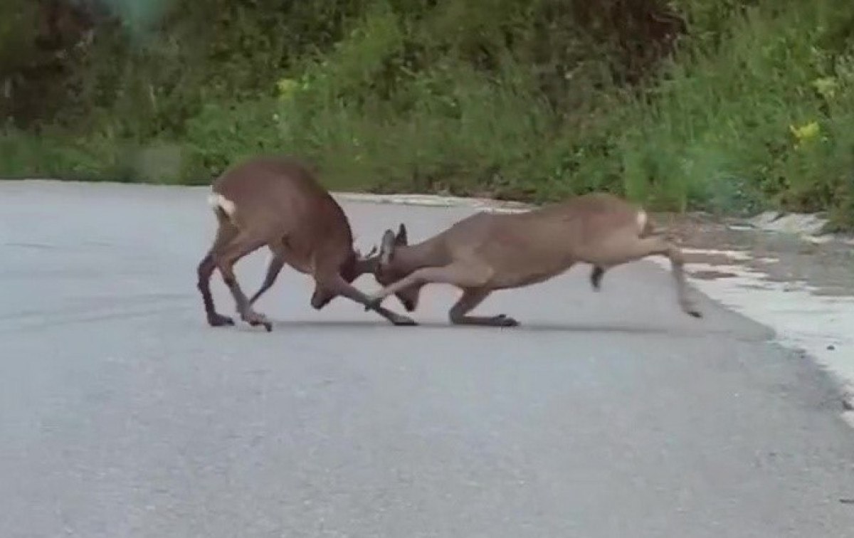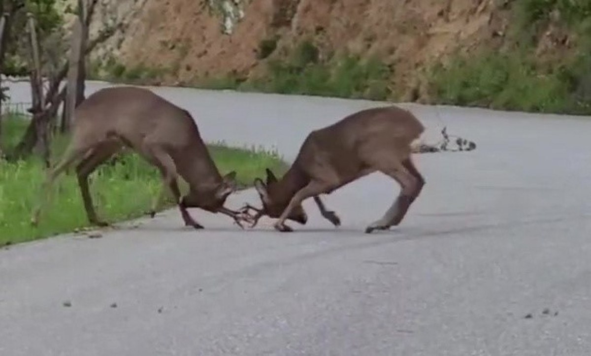Düzce’nin Cumayeri ilçesinde, yüksek kesimlere doğru ilerleyen bir sürücü, yol kenarında iki karacanın boynuzlarıyla inatçı bir şekilde birbirlerine vurduğunu fark etti.