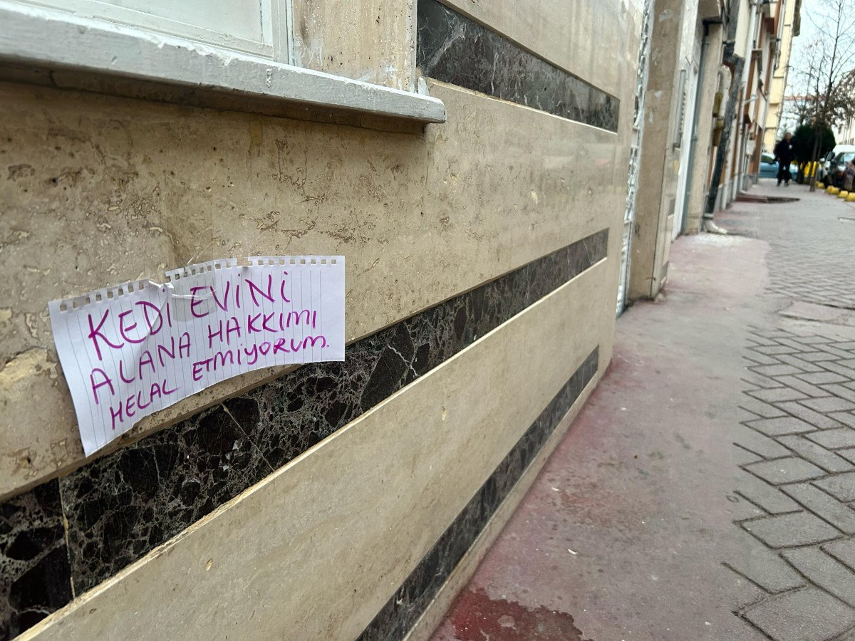 Vatandaş, kedi evinin önünde durduğu binanın duvarına, “Kedi evini alana hakkımı helal etmiyorum” yazılı kağıt yapıştırdı.