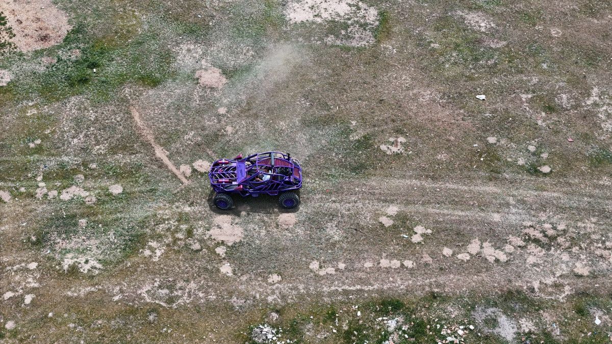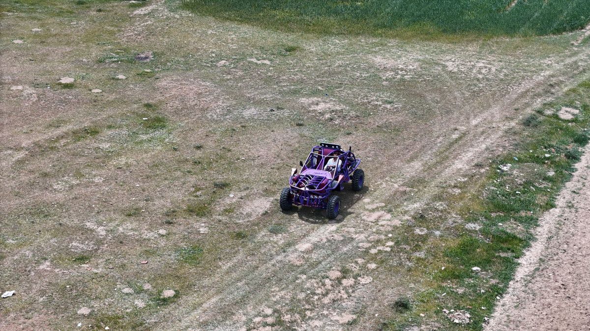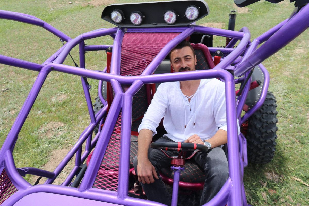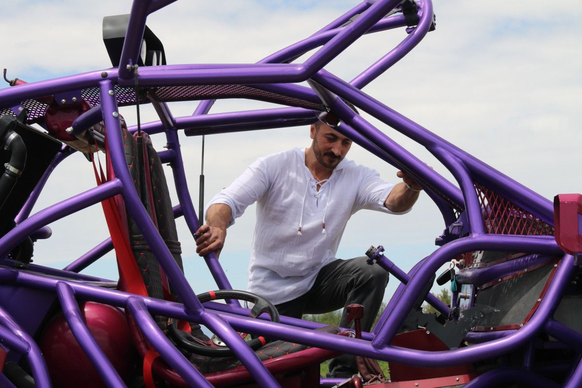 Aracını mora boyayan ve Kaynağından koltuğuna kadar bütün aksamları eliyle yapan Fatih Erdoğan, yerde deneme sürüşleri yaptı.