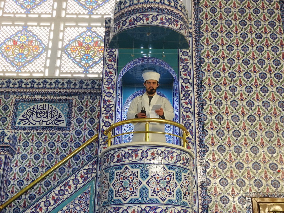 Cuma namazı için minbere çıkan Emre Lök, cami cemaatine kendi lisanıyla hutbe veriyor.