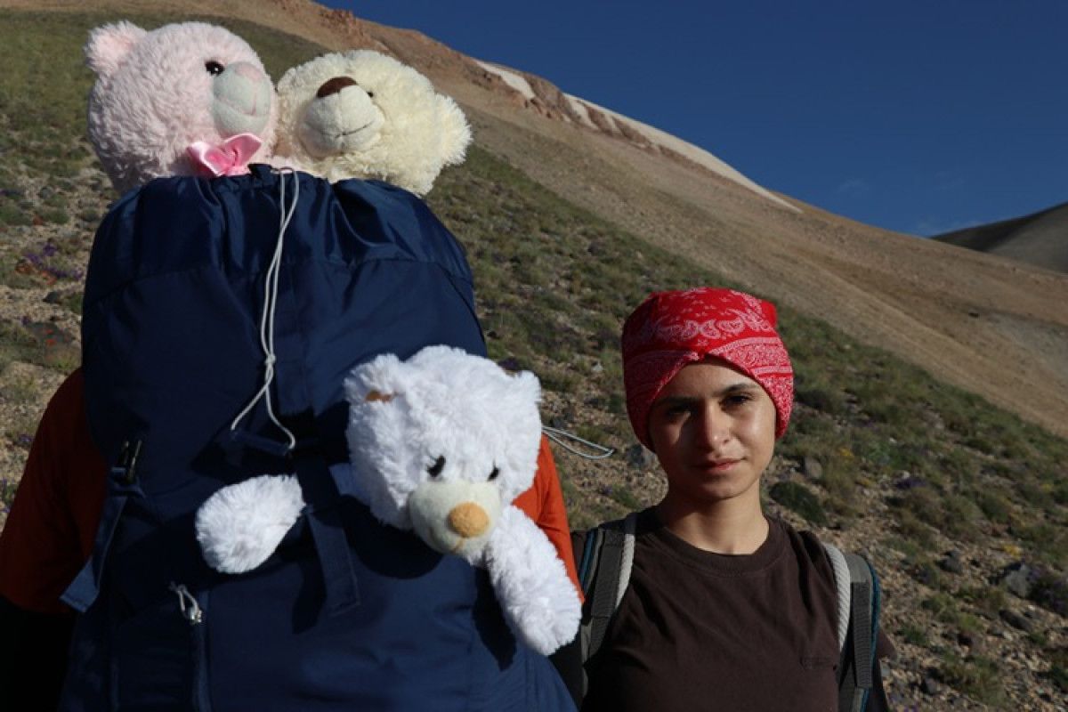 15 saatlik bir yürüyüşle tamamlanan tırmanışın sonunda Erkuş, dorukta kardeşlerini temsil eden ayıcıklarıyla fotoğraf çektirdi, görüntünün keyfini çıkardı.