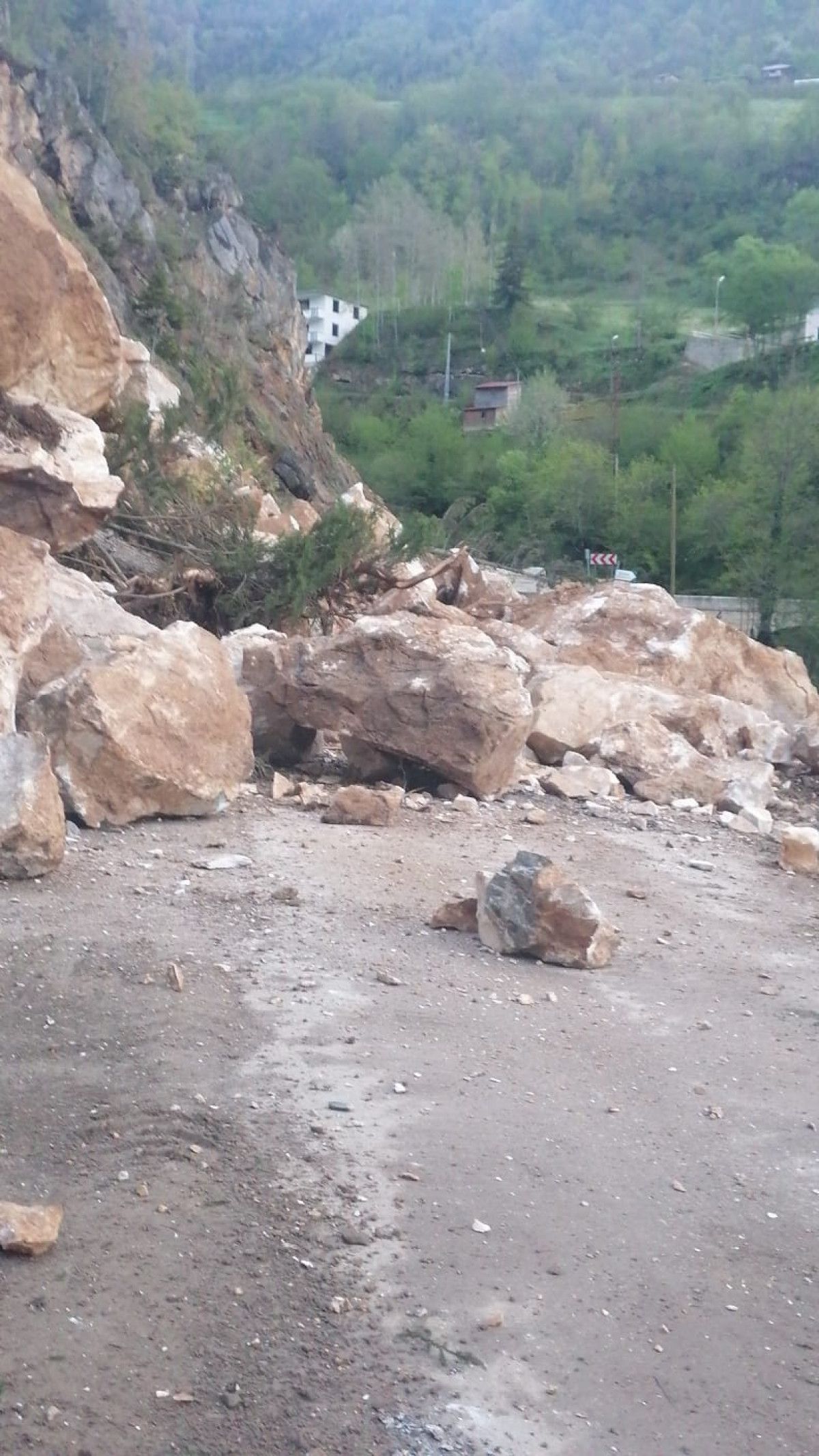 Heyelan sonucu yamaçtan kopan toprak ve kaya modülleri sürüklenerek, Yavuzkemal beldesi yolunu ulaşıma kapattı.