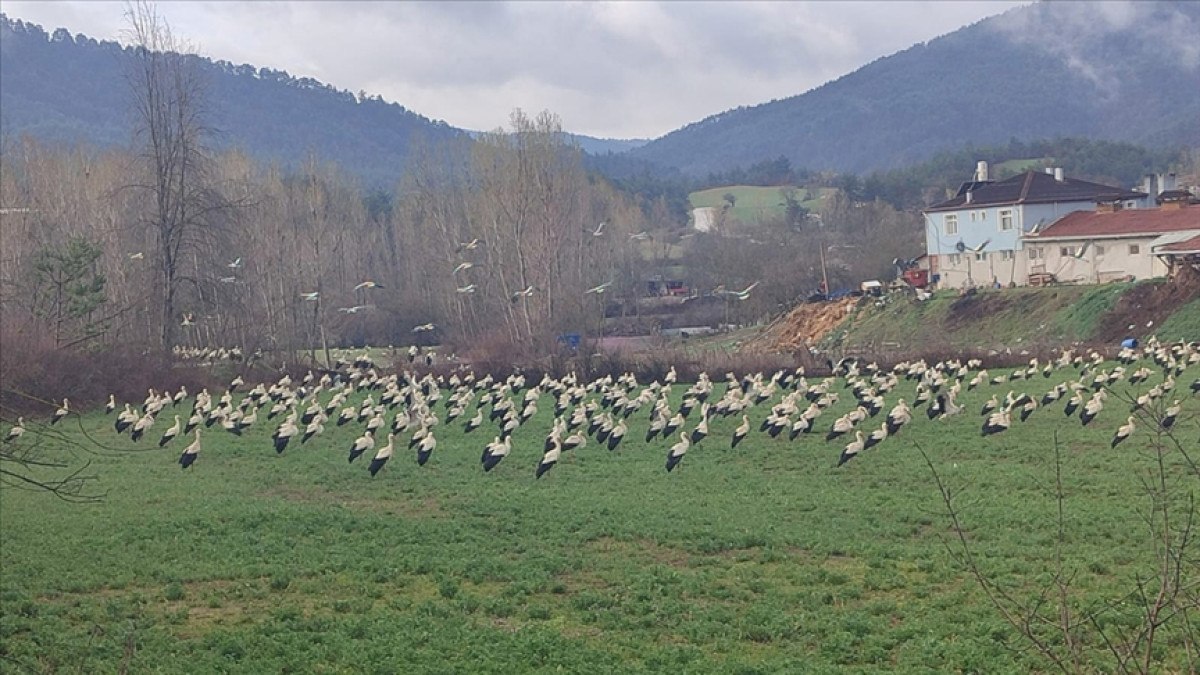 Uzak diyarlardan gelerek daha sıcak bölgelere doğru süzülen leylekler, yeşermeye başlayan tarlada kısa süre dinlenerek gökyüzüne karşı muhteşem bir manzara oluşturdu. Bir araya gelen sürü, kanatlarını dinlendirip güç topladıktan sonra, göç yollarına kaldıkları yerden devam etti.