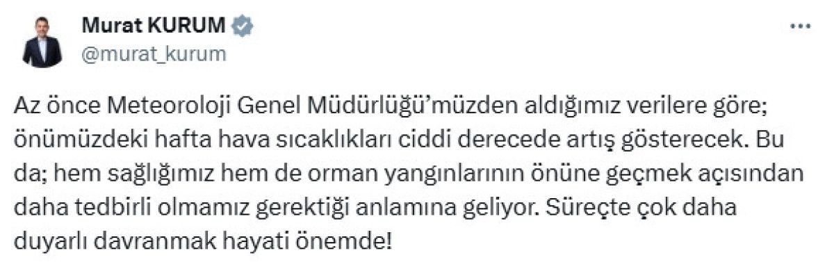 Çevre, Şehircilik ve İklim Değişikliği Bakanı Murat Kurum, sosyal medya hesabından yaptığı paylaşımda, Meteoroloji Genel Müdürlüğünden alınan bilgilere nazaran sıcaklıkların gelecek hafta artış göstereceğini belirtti.