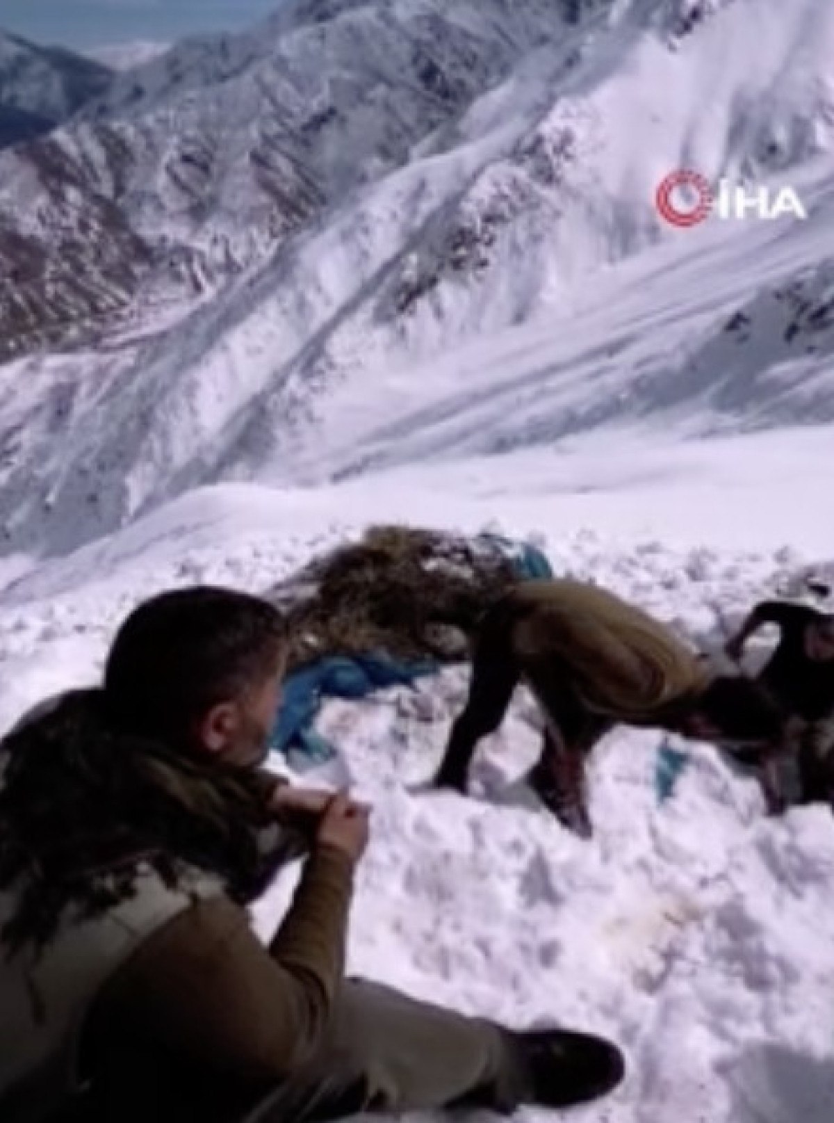 İlçenin Yeşiltaş köyü sakinleri, hayvanlarını beslemek için yaz aylarında 3 bin rakımlı dağlardan biçip biriktirdikleri ot yığınlarını karlı dağlardan kızak ve brandaya yükleyip 4 kilometrelik dik yamaçtan köylerine indiriyorlar.