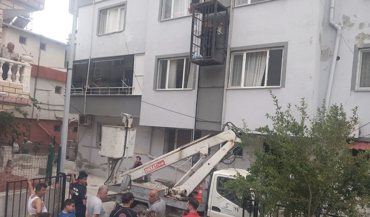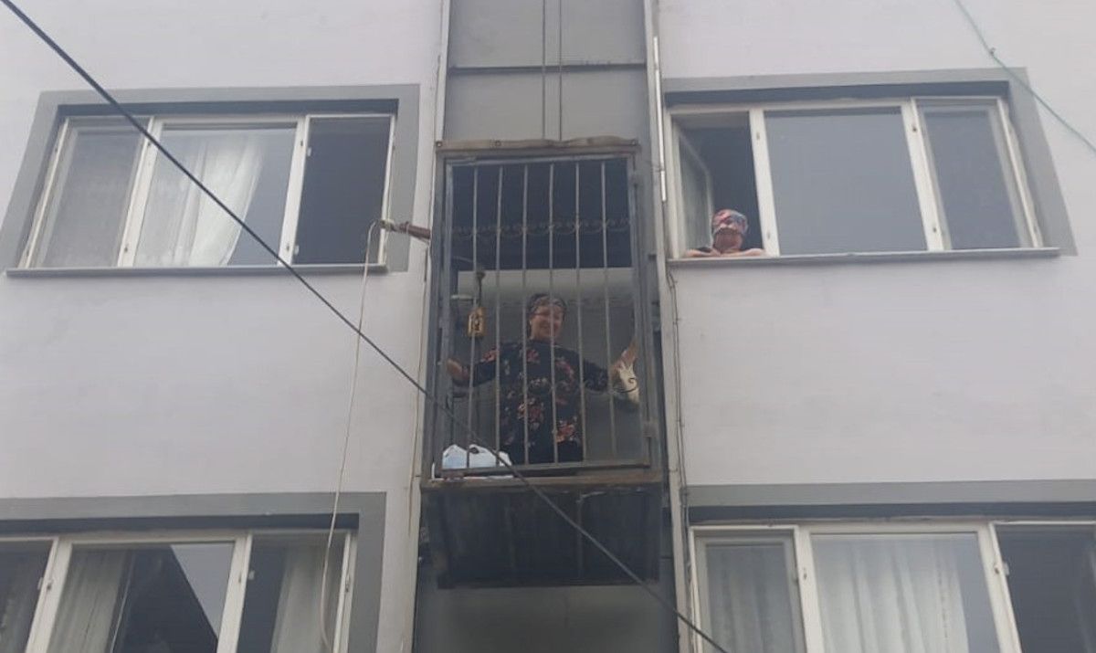 Dördüncü kattaki konutundan aşağı inmek için asansörü kullanan bayan, kurtarılmak için itfaiye takımlarının gelmesini bekledi.