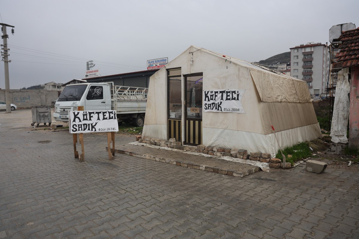 Depremde kaldıkları çadırı iş yerine dönüştüren baba Sadık Kodalak, “Depremden sonra bu çadırın içinde yaşıyorduk. Evimizin yanında sıkıntılı bir bina vardı. Sorunlu bina üzerimize yıkılma korkusuyla evimize geçemedik. Binayı yıkıp enkazını kaldırdıktan sonra evimize geçtik. Depremden sonra kaldığımız çadırı da iş yeri olarak kullanmaya başladık. Burada eşim ve çocuklarımla birlikte çalışıyoruz. Burada köftecilik yapıyoruz.