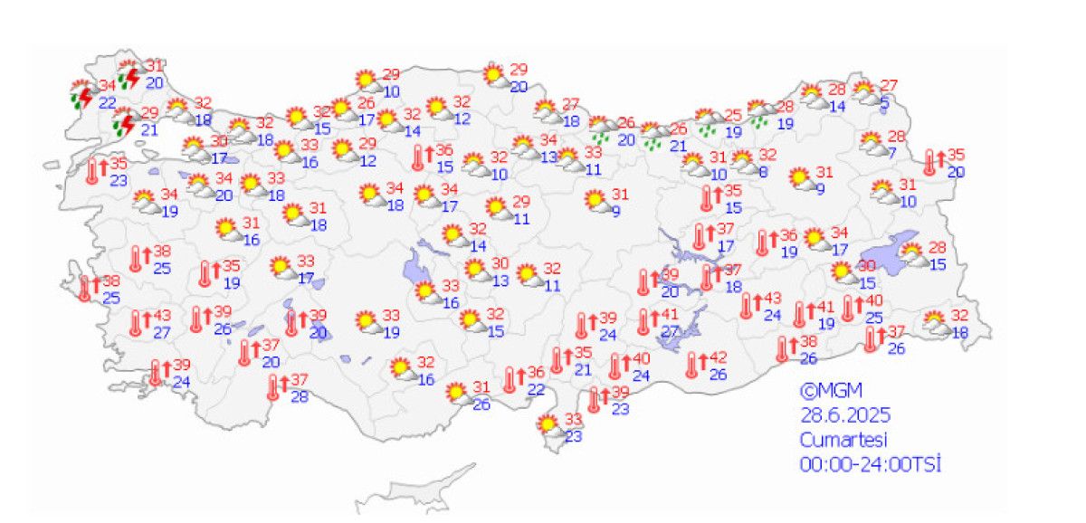 Cumartesi günü yurt genelinde sıcak bir hava hakim olacak. Güneydoğu Anadolu bölgesinde sıcaklıklar 43 dereceye kadar çıkacak. Akdeniz kıyılarında ise hava sıcaklıkları 37 dereceye ulaşacak.