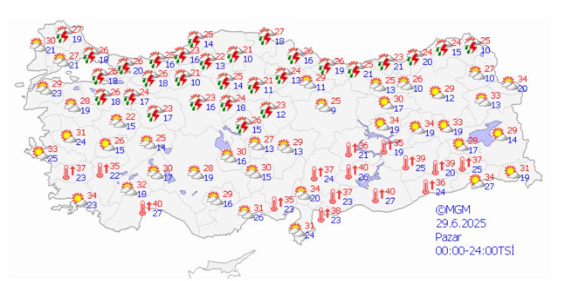 Sıcaklıkların düşmesiyle Pazar günü, Marmara’nın doğusu ve İç Anadolu’nun kuzeyinde (Ankara ve çevresi) gök gürültülü sağanak görülecek.
