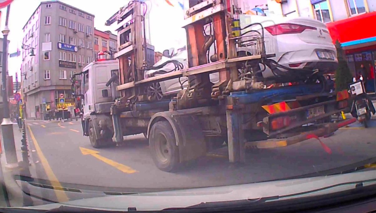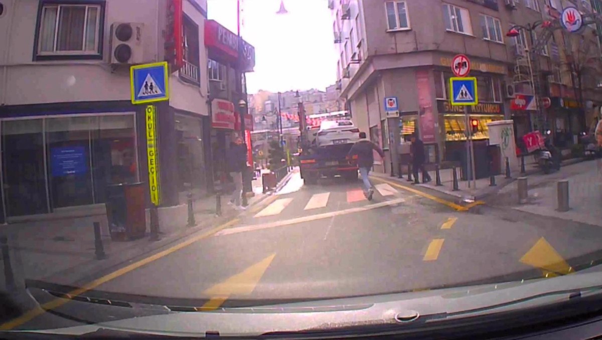 Çekilen aracını kurtarmak için metrelerce koşan ve bağıran sürücü, yorulunca yolda park halinde olan hafif ticari aracın şoföründen yardım istedi. Bir süre sonra çekiciyi durduran adam, aracını indirtti. Maratonu andıran o koşu ise hem araç hem de cep telefonu kamerasına saniye saniye yansıdı.