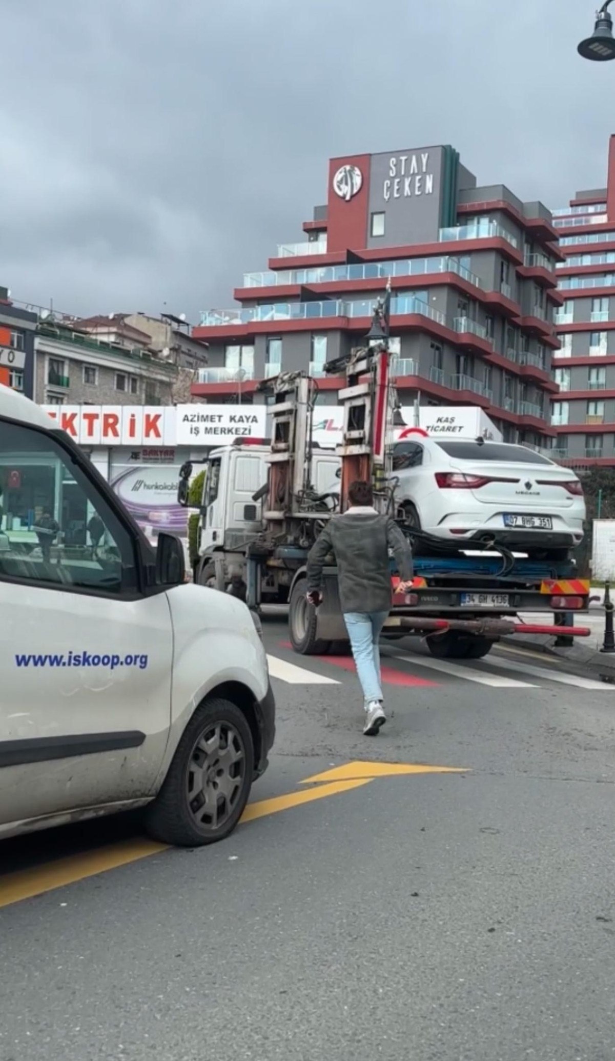 Kağıthane’de aracını yasak olan yere park ederek bankaya giden sürücü, trafik çekicisinin aracını götürdüğünü görünce metrelerce peşinden koştu.