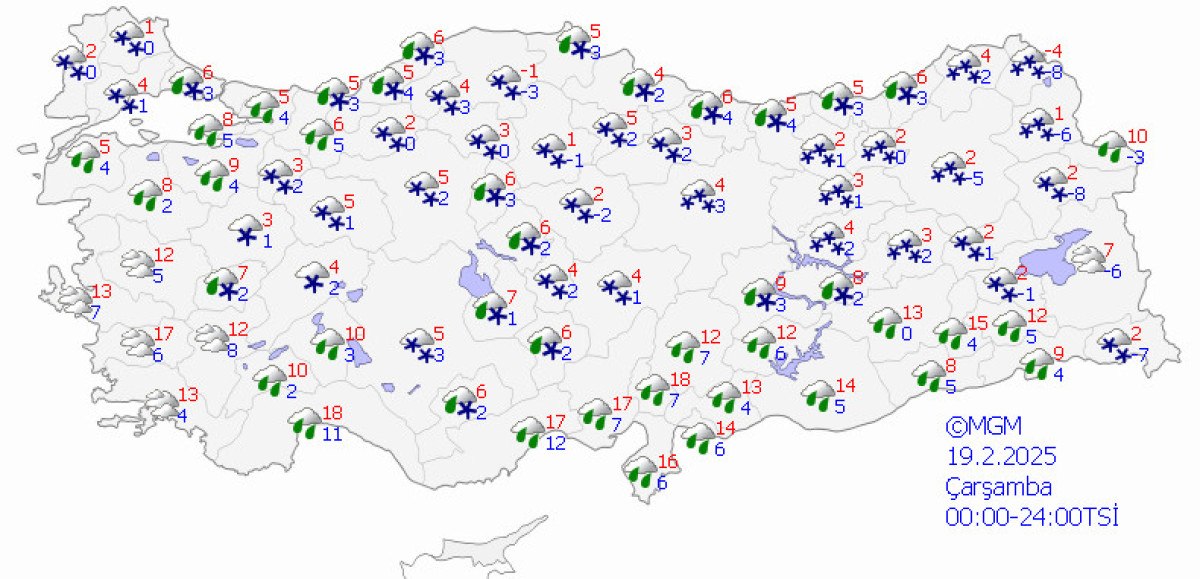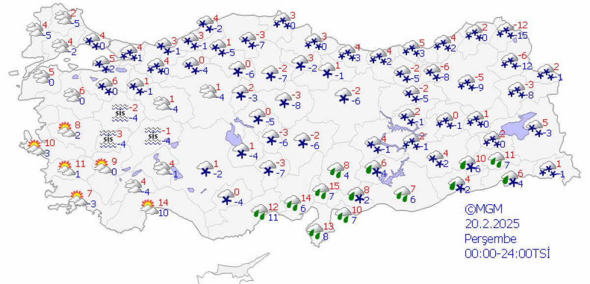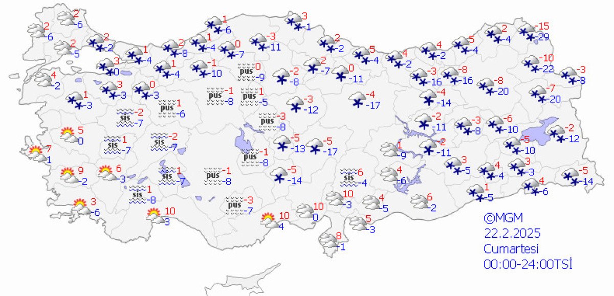 “Çarşamba gününden itibaren bir haftalık periyotta gerçekleşmesi beklenen en düşük hava sıcaklıkları şöyle: Ankara -8, İstanbul -1, İzmir 1, Konya -8, Antalya 3, Bolu -10, Samsun -3, Trabzon -2, Erzurum -20, Diyarbakır -5.”
