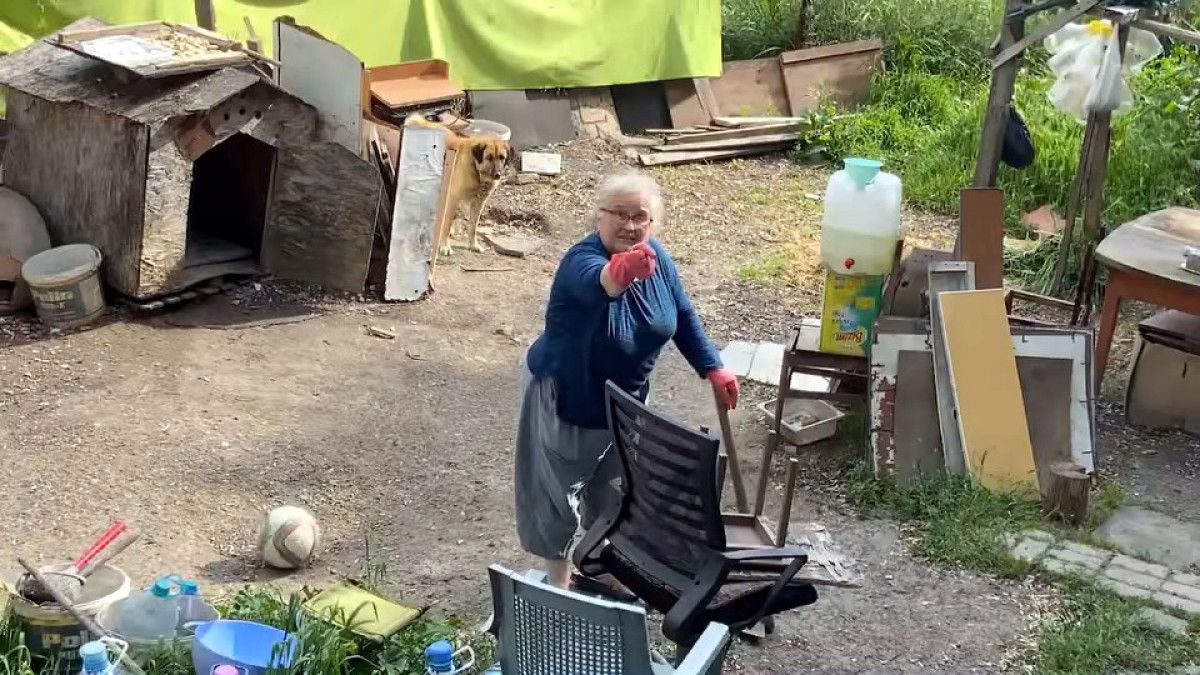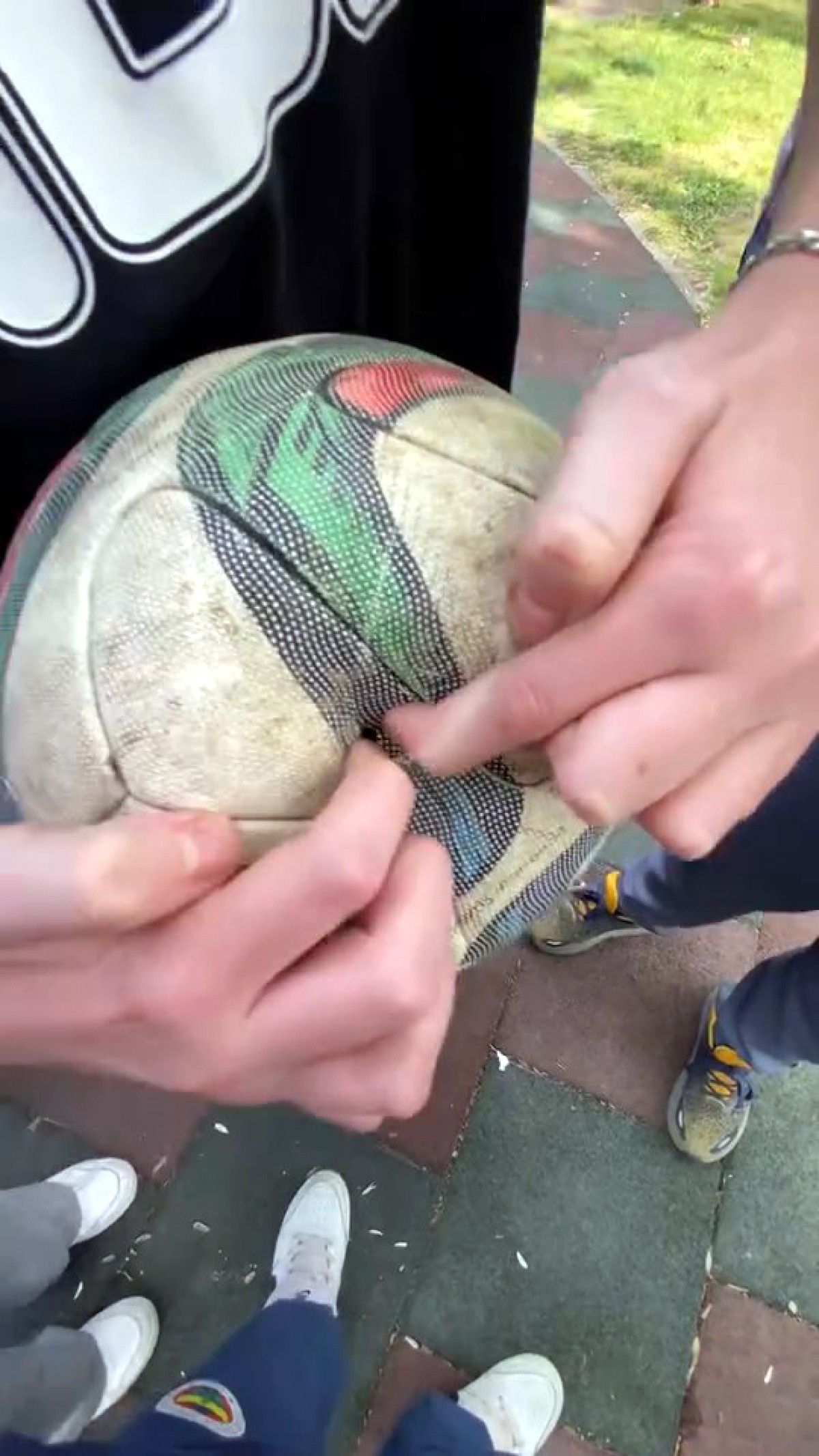 Kadın bahçeye kaçan topu patlatırken, bayanın eşi ise çocuklara toplarını geri verdi.