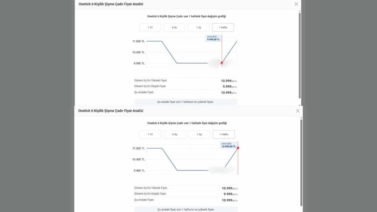 Benzer şekilde, 23 Nisan’da 9 bin 999 liraya satılan 6 kişilik çadır da deprem sonrası bin lira artışla 10 bin 999 liraya yükseldi.