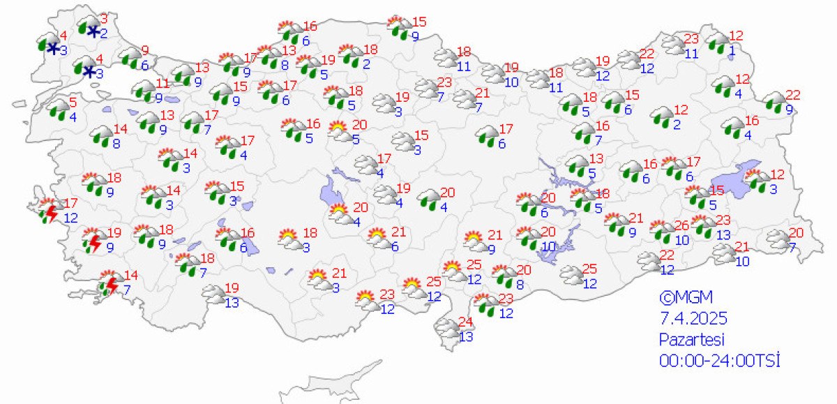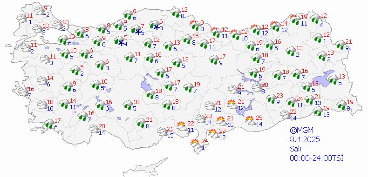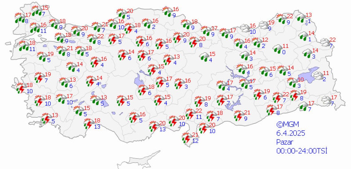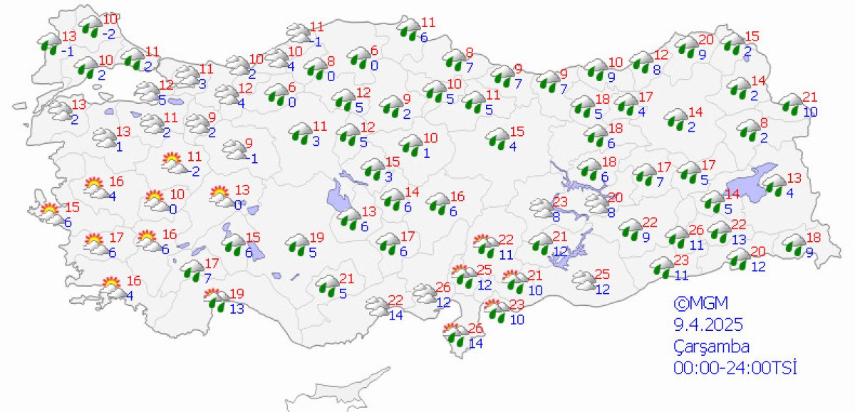 Yağışların genellikle yağmur ve sağanak, güney, iç ve batı kesimlerde yer yer gök gürültü sağanak, Doğu Karadeniz’in iç kesimleri ile Doğu Anadolu’nun kuzeydoğusunun yüksek kesimlerinde karla karışık yağmur ve kar şeklinde görülmesi beklenen yağışların Doğu Anadolu’nun batısı ile Antalya’nın doğusu, Mersin, Adana, Kahramanmaraş, Osmaniye, Hatay kıyıları, Aksaray, Bitlis, Şırnak, Hakkari, Adıyaman ve Siirt çevrelerinde yer yer kuvvetli olması bekleniyor.