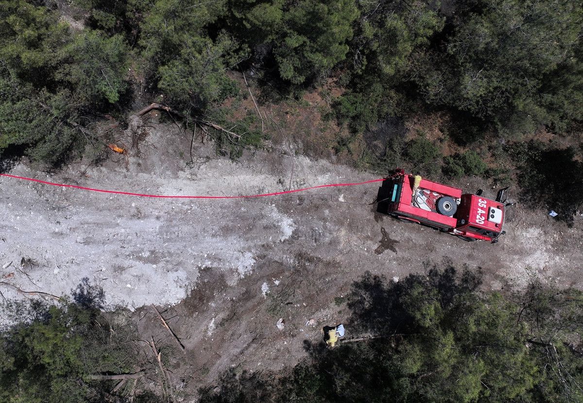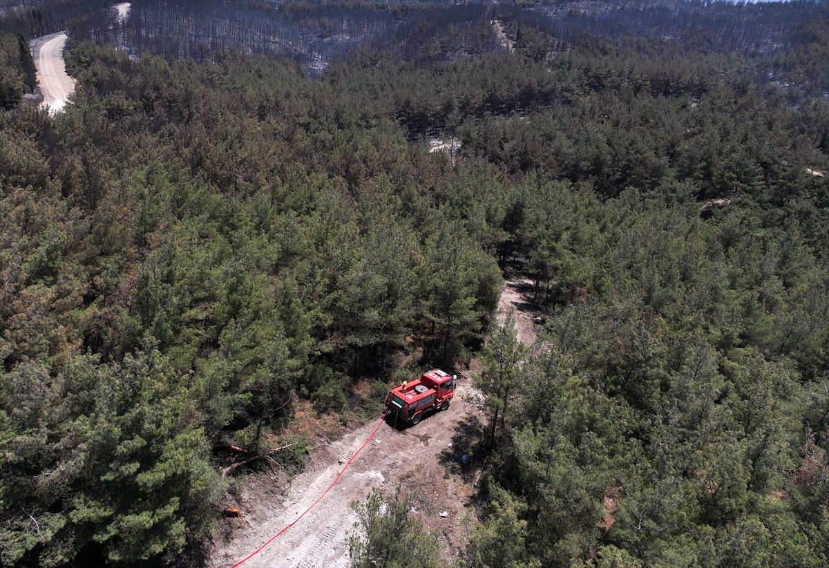 İzmir Orman Bölge Müdürlüğüne ilişkin 6 helikopter, 46 arazöz, 9 dozer, 13 su ikmal aracı ve su tankeri, gece boyunca alevlerle adeta savaştı.