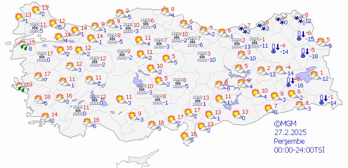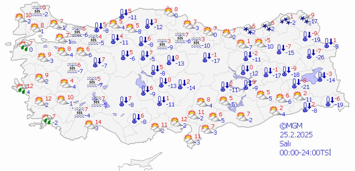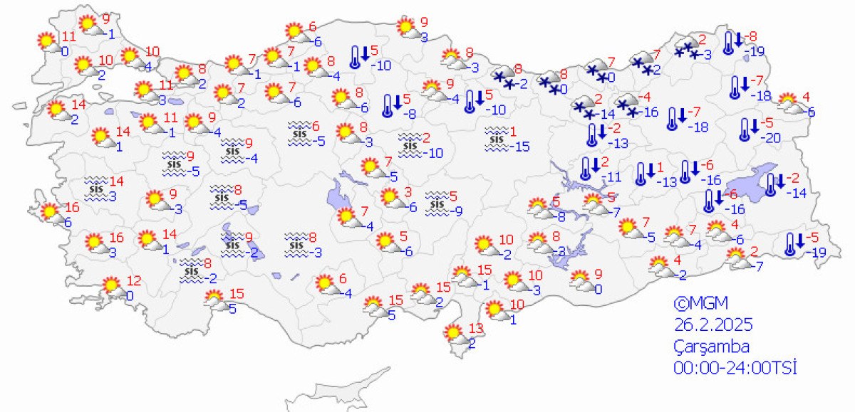 Meteoroloji Genel Müdürlüğü tarafından yapılan tahminlere göre: Ülkemizin kuzey, iç ve doğu kesimlerinin parçalı ve çok bulutlu, Karadeniz (Düzce ve Bolu hariç) ile Erzincan, Ardahan ve Sivas çevreleri ile Kayseri’nin kuzey ve doğusu ve Yozgat’ın doğusunun kar yağışlı, diğer yerlerin az bulutlu geçeceği tahmin ediliyor.