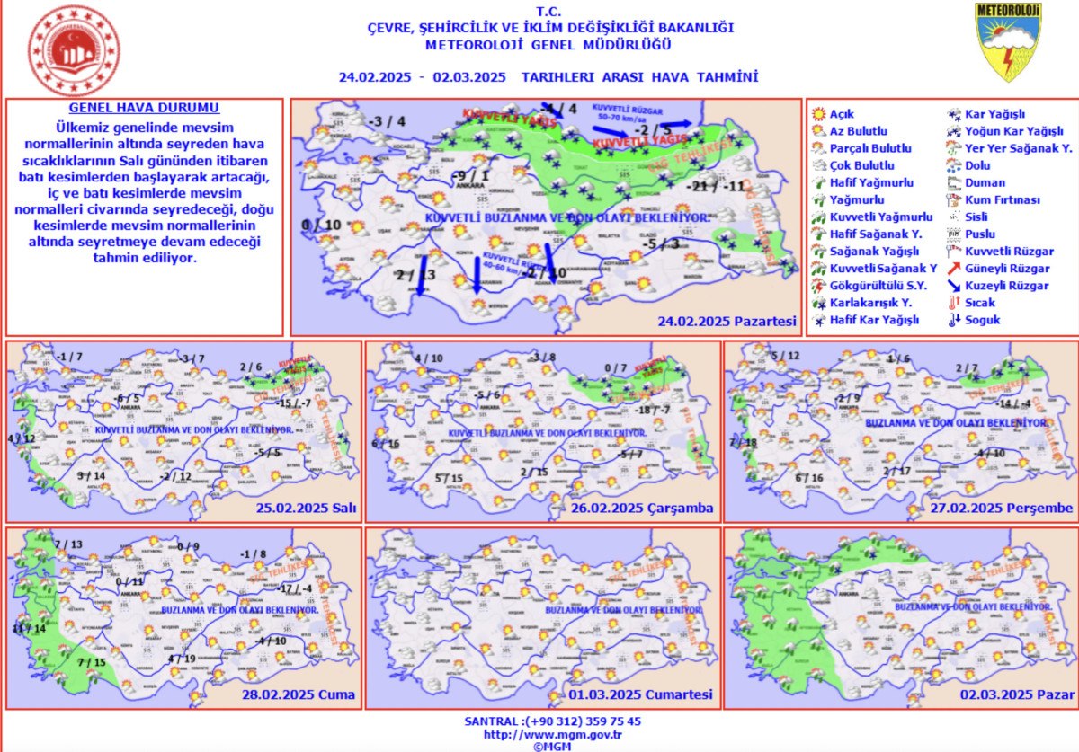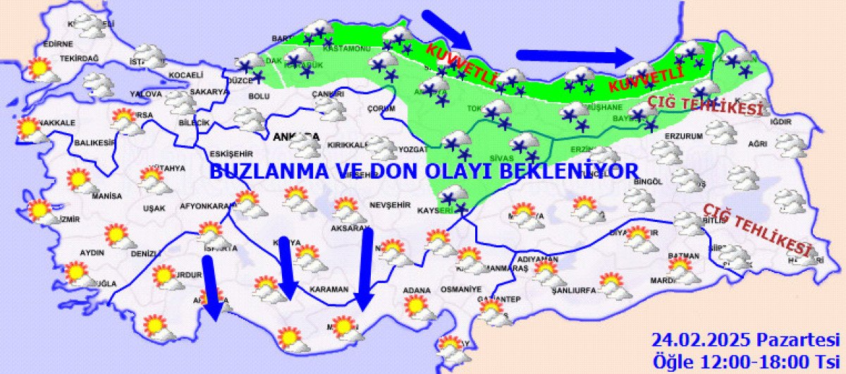 Kuzey, iç ve doğu kesimlerde kuvvetli olmak üzere ülkemiz genelinde buzlanma ve don ile sis ve pus olayı bekleniyor.