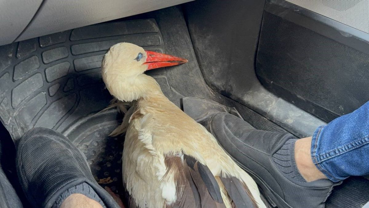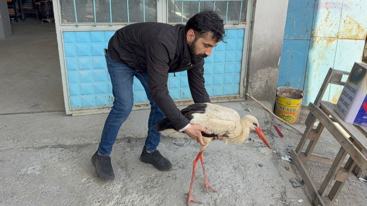 Uçamayan ve bir gözü görmeyen leyleğin üşümüş ve hasta olduğunu düşünen Özdal, hayvanı aracına alarak iş yerine götürdü.