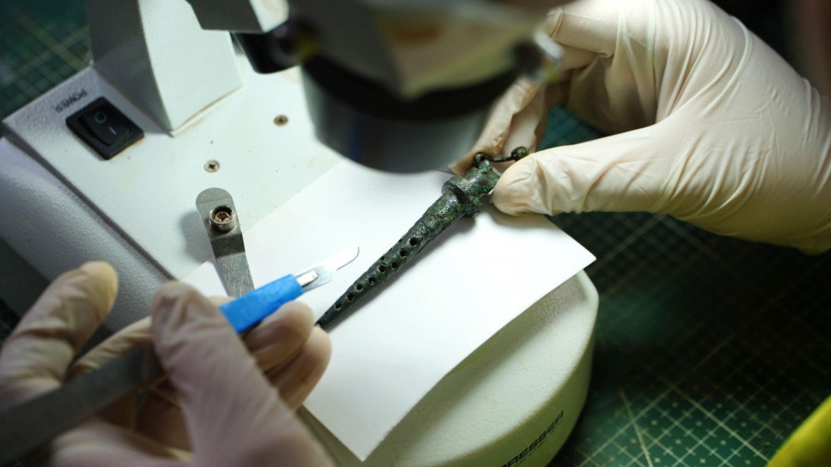 Kazı çalışmalarında arkeolojik açıdan önemli bulgu ve buluntulara rastladıklarını belirten Çelikbaş, “Bu buluntulardan biri de bronz bir obje. Bu bronz objenin antik dönemde filtre olarak kullanıldığını tespit ettik. Antik dönemde insanların içeceklerini filtreleyen, daha konforlu bir şekilde içmelerini sağlayan obje. Kronik bir forma sahip 9,2 santimetre uzunluğuna sahip bir üzerinde taşıma halkası var. Aslında antik dönemde insanların bronz objeyi bir sefer kullanmadığını, kullandıktan sonra temizlenerek muhafaza altına alındığını ve defalarca kullanıldığını göstermekte. Konik bronz objenin üzerinde delikler var. Bu delikler filtre görevini görüyor” diye konuştu.
