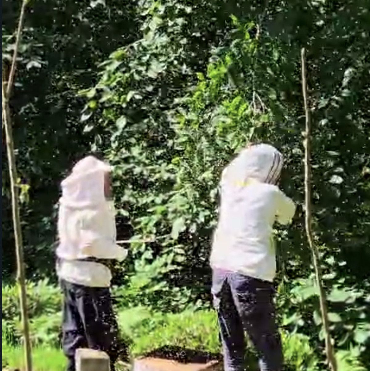 Özel kıyafetlerini giyen arıcılar, koldaki kraliçe ve beraberindeki binlerce arıyı boş bir kovana aktardı.