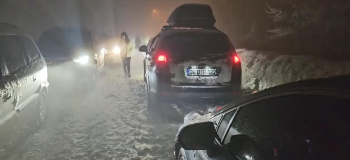 Kayak merkezine çıkmak isteyen bazı araçlar kaza yapıp, bazıları da yolda mahsur kalınca trafik tamamen durdu.
