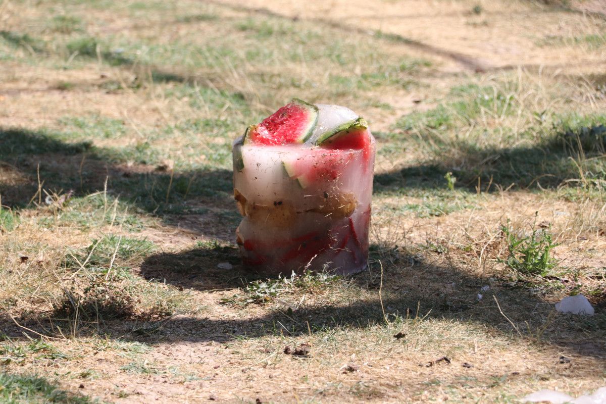 Karpuz, armut, çilek, elma ve kayısı yıkandıktan sonra küçük dilimler halinde kaplara konuluyor, su da eklenerek buzlukta dondurulan meyveler maymunlara veriliyor.