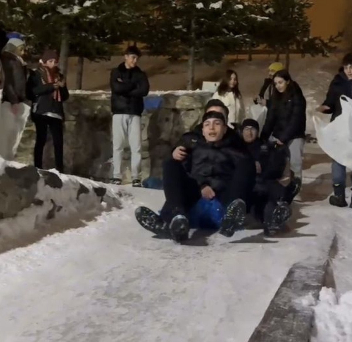 Polisler, poşetle kayan çocuklara eşlik etti, onlarla sohbet etti.