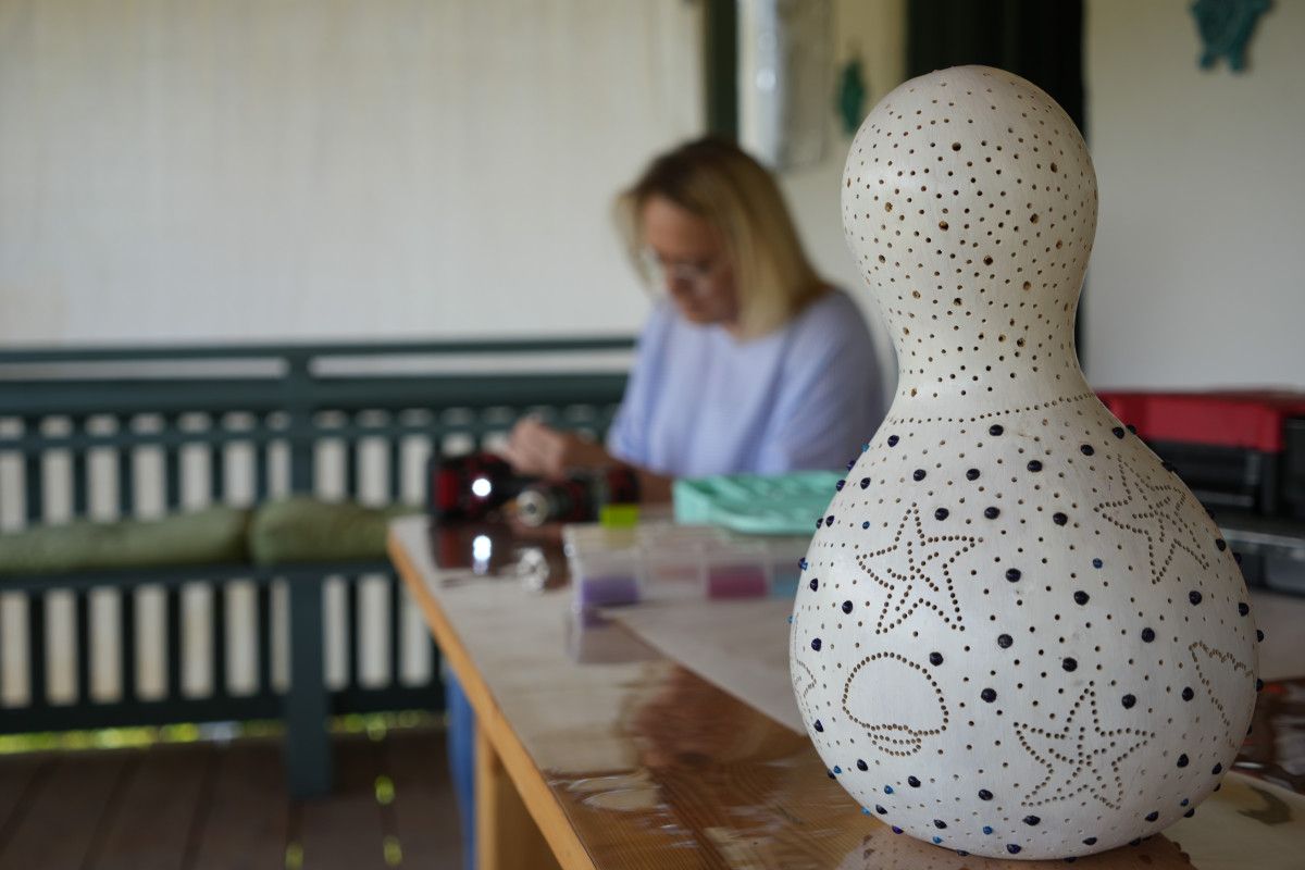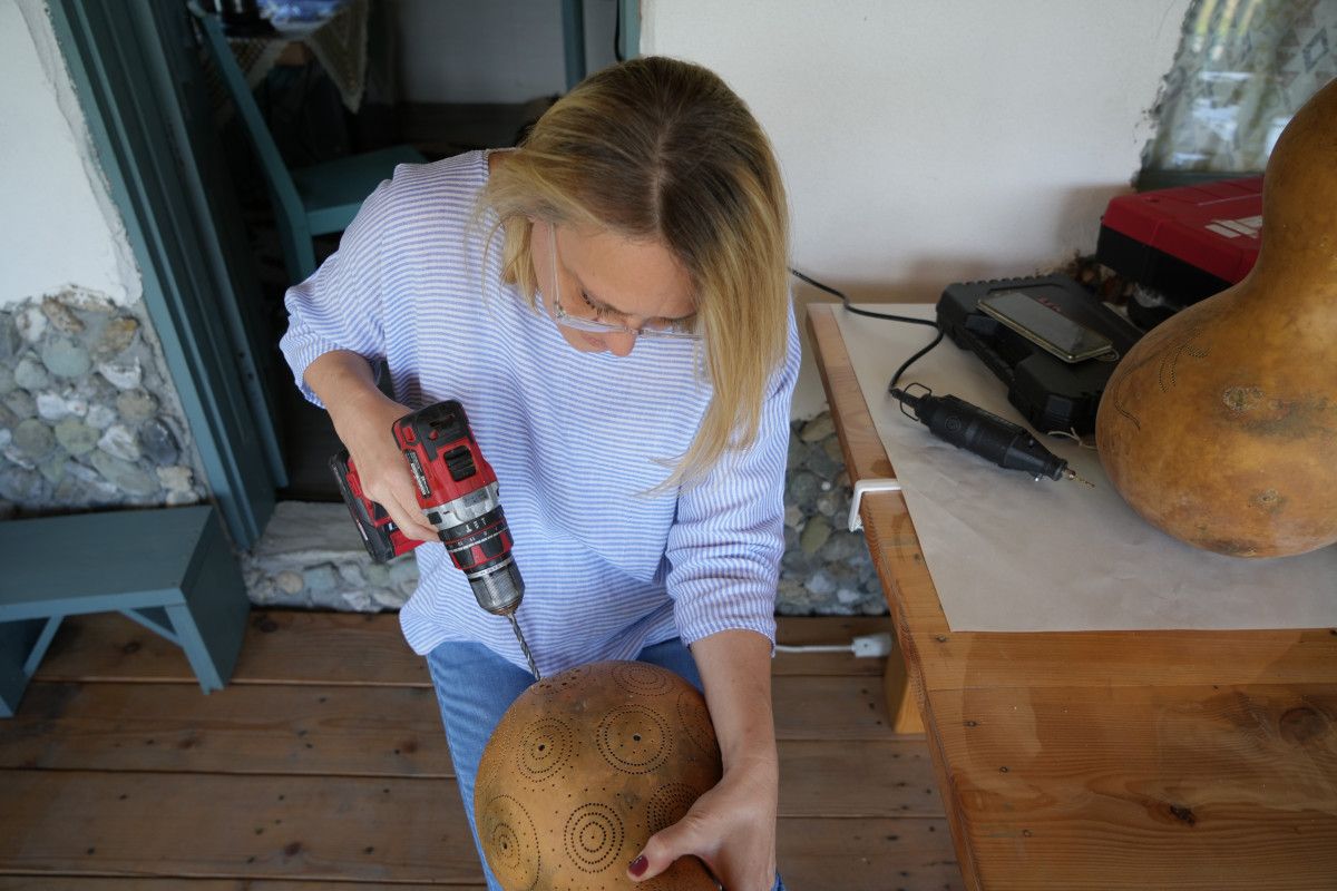 Bu ilgisini geliştiren Aldemir, Uzuntarla’da konutunun yanında bulunan ahırı atölyeye dönüştürdü. Aldemir, atölyesinde su kabağını işleyerek gece lambası, avize üzere çeşitli dekoratif süs eşyaları tasarlıyor.