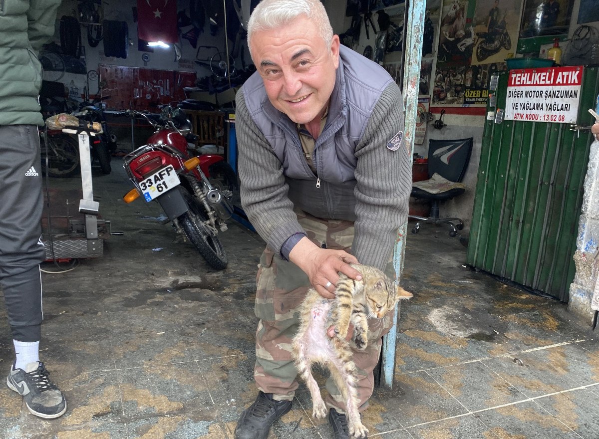Manisa’nın Alaşehir ilçesinde motosiklet tamirciliği yapan İbrahim Aydın, iş yerine giren yaralı kediyi görünce vakit kaybetmeden veterinere götürdü.